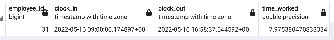 (SELECT EXTRACT(epoch FROM (clock_out-clock_in))::int/3600) AS time_worked但这归结到了7。
