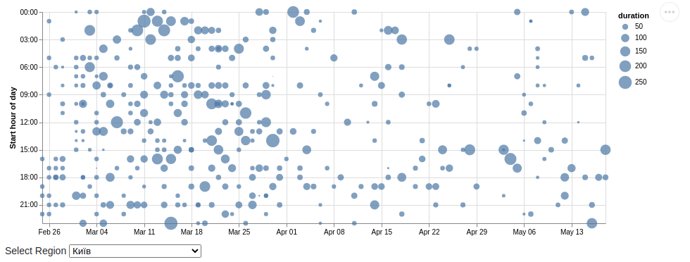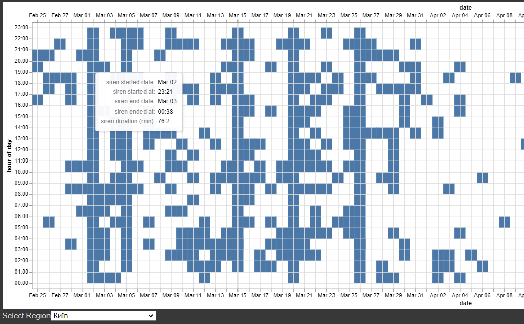 例如,空气警报开始于3月2日,23:21 (晚上11:21),结束于3月3日,00:38,然后整个一天都会被填满,你可以在屏幕截图上看到。
