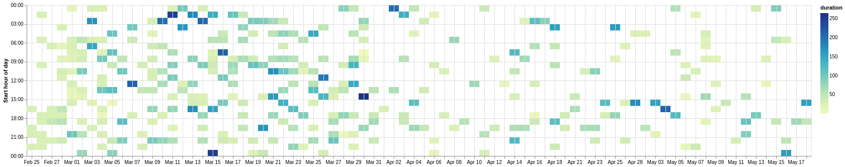 另一种方法是考虑不同的方式可视化相同的数据。例如,您可以只显示开始时间,然后使用标记的颜色或大小来表示持续时间: