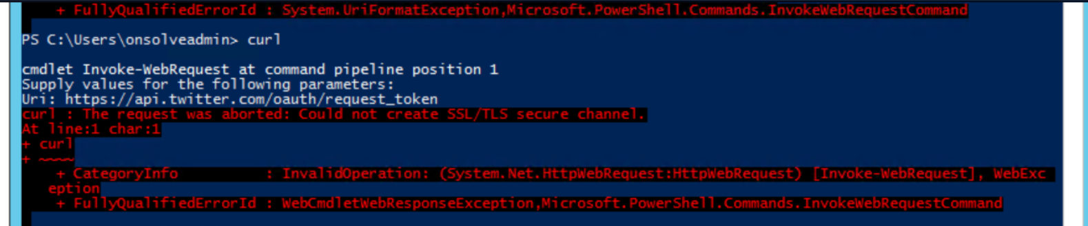 当您调用api.twitter.com时,需要确保您使用的是TLS1.2 - Twitter不再支持旧的TLS v1,如果遇到TLS问题,请尝试通过执行以下命令更新服务器机器上的Powershell以始终使用TLS1.2: