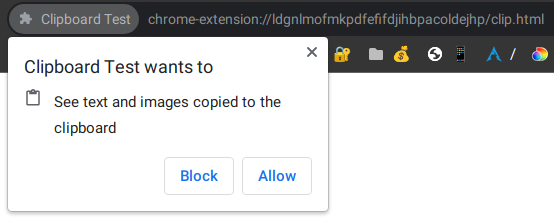 我正试图在Google扩展打开的选项卡中使用navigator.clipboard.readText()。当我这样做时,即使我已经授予了权限,下面的权限警报仍然会出现在每个页面加载中: