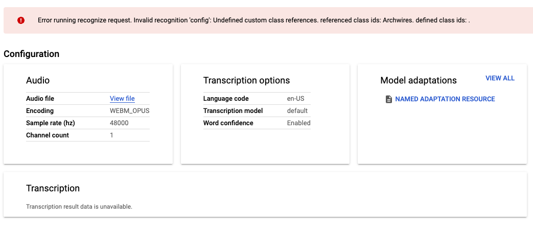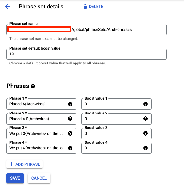 我是跟随谷歌文档做转录工作,为它提供一个PhraseSet和CustomClass。根据我的理解,谷歌( PhraseSet )用谷歌应该期待的短语定义了这种结构。CustomClass在这些短语中定义了特定的单词。