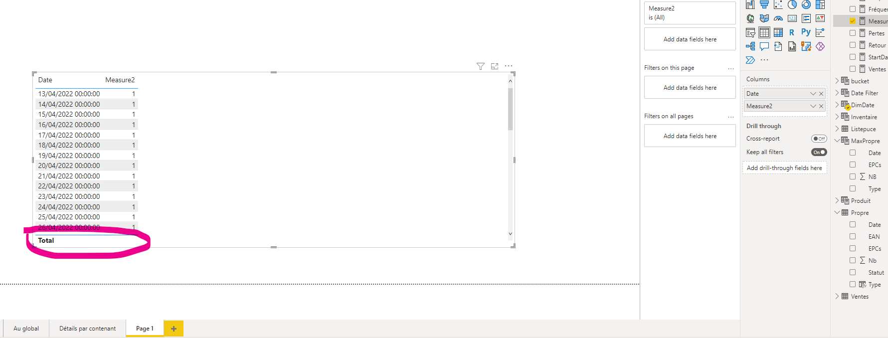 Measure3 = IF(HASONEFILTER('DimDate'[date]),[Measure2],SUMX(VALUES('DimDate'[date]),[Measure2]))...and在你的桌子上使用它。