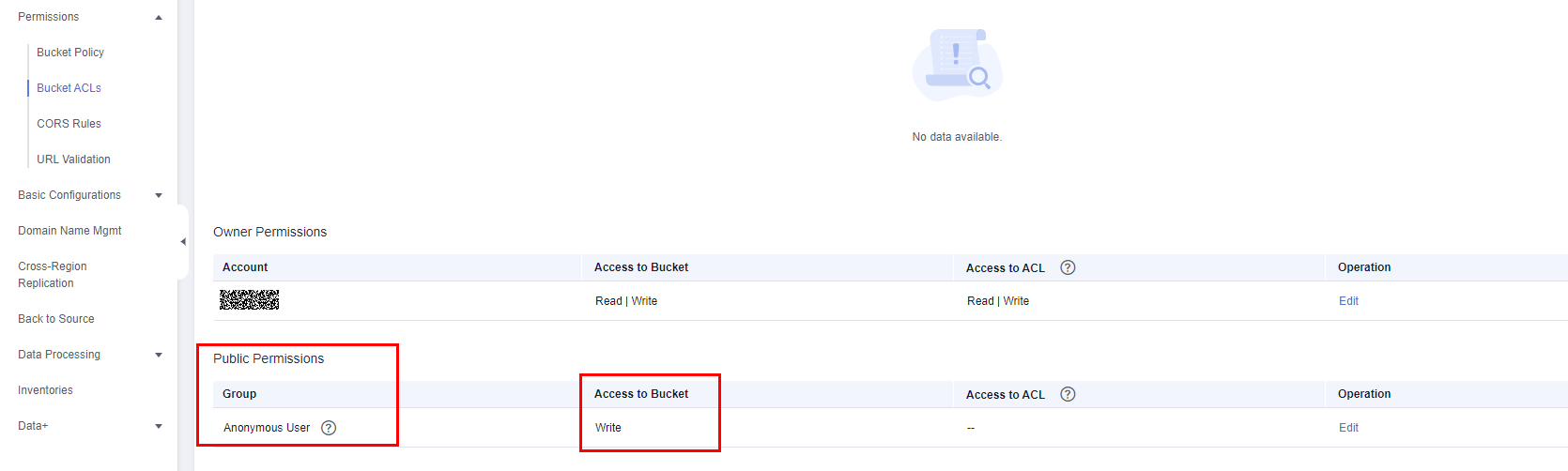 我在华为的云中创建了一个OBS桶。我希望用户谁没有帐户在华为云上传文件到桶。我看不出批准这一具体行动的任何选择。但是,我已经授予匿名用户读取和写入OBS存储桶的权限,但是,这并不允许匿名用户将文件上传到桶中。