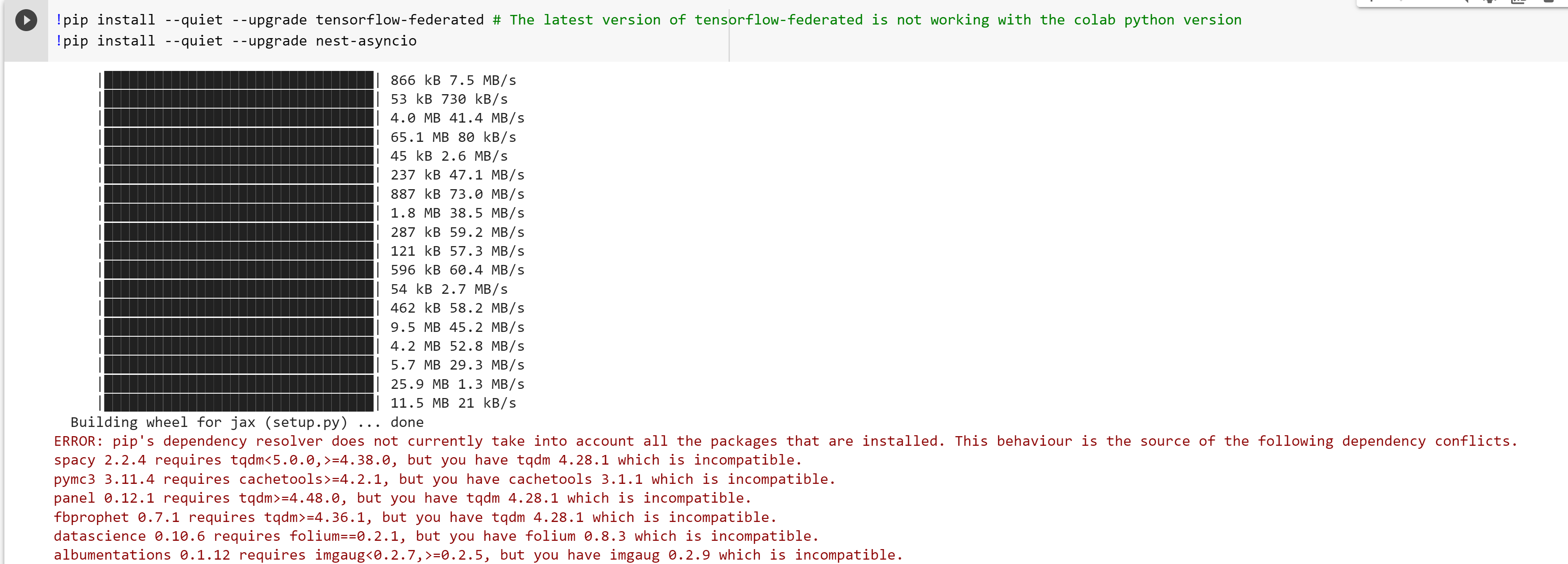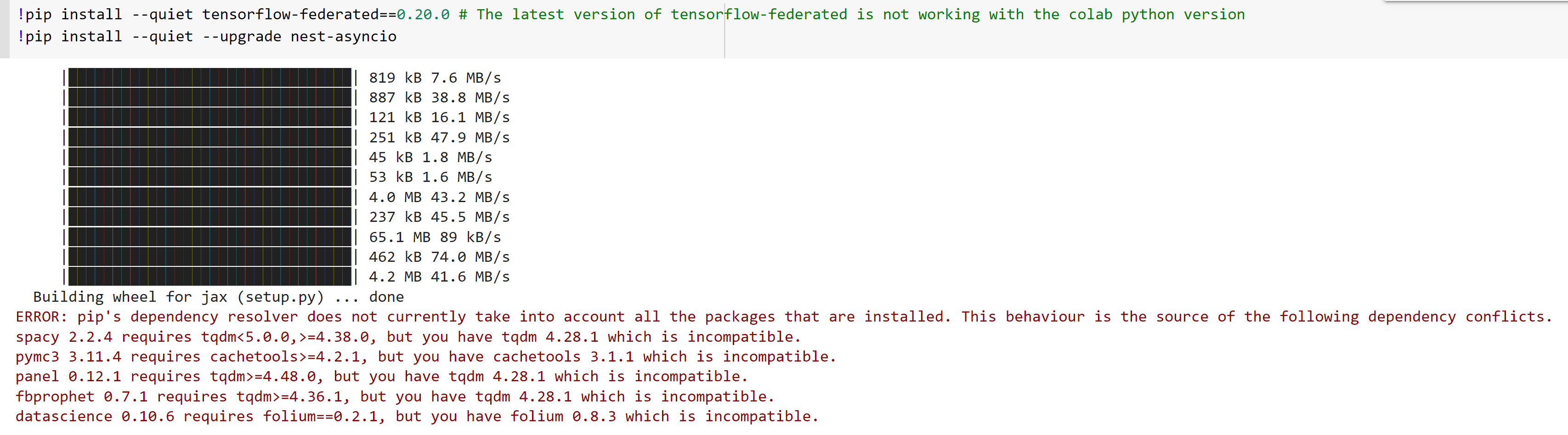如果我想安装新版本,它会在安装过程中给出“这需要这个版本,但您有这个版本”。我很困惑。有没有一种简单的方法来使用Tensorflow联合学习?我试着在本地安装它,但也不起作用。为什么用起来这么难?