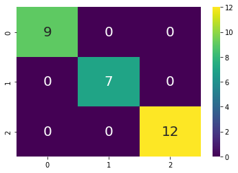 sns.heatmap(con_mat,annot=True,annot_kws= {"size":20},cmap="viridis")