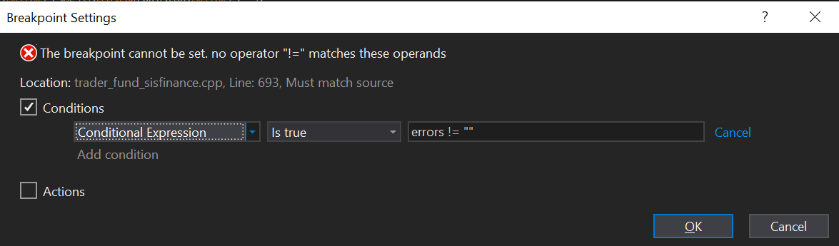 我试图为我的调试设置一个条件断点,但是VS总是返回这个错误: