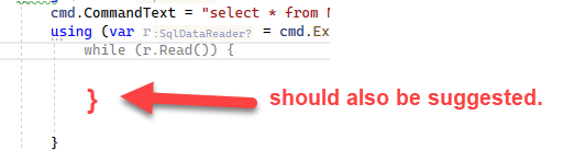 当我在Visual 2022中使用AI辅助的IntelliCode时,我希望Visual也插入结束的大括号--而不仅仅是开头的。然后光标应该在括号之间。