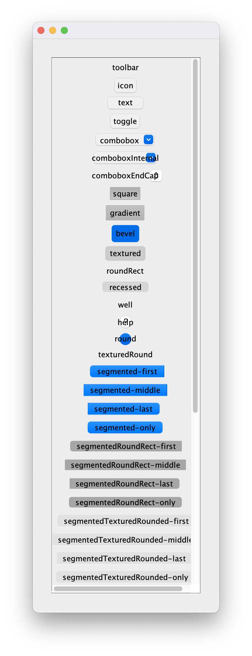 所以,我花了很多时间研究"Aqua“外观和感觉的源代码,我发现AquaButtonUI有一个”按钮类型“客户端属性,用于确定边框类型。