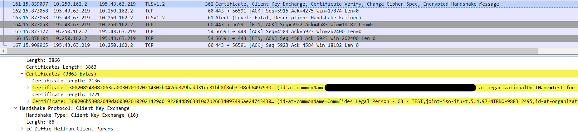 检查Wireshark中的有效负载,我可以看到只发送了两个证书(1,2)和根(3)丢失。