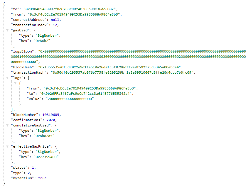 所以我连接到rpc并拥有提供者,我使用getTransactionreceipt函数获得事务的全部信息,并使用abi解析编码的数据,