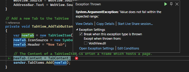 我目前正在使用WinUI 3开发一个浏览器,我已经在浏览器中实现了TabView,每当我的c#代码生成一个新的选项卡时,我希望它能够自动使用Xaml文件中的TabContent(XAMLElement)元素。但始终显示如下错误: