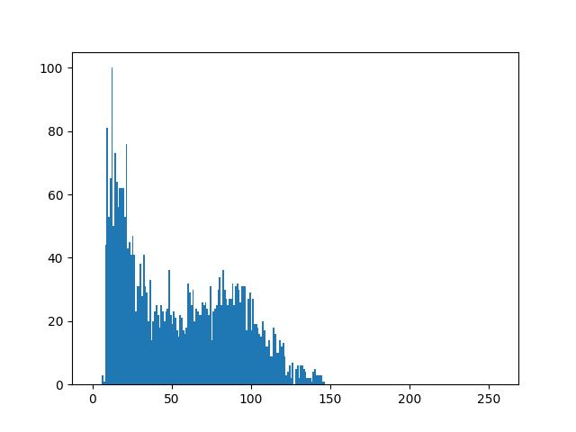 现在,我想用选定区域的温度进行第二次区分。我能够用opencv制作所有冠层区域的轮廓(所以我有一个代表树冠区域的所有轮廓的完整列表-有一些地面像素)。我的目标是使每个轮廓区域的直方图显示该区域内每个像素值的密度。希望我能删除太热的像素(也就是背景像素)。