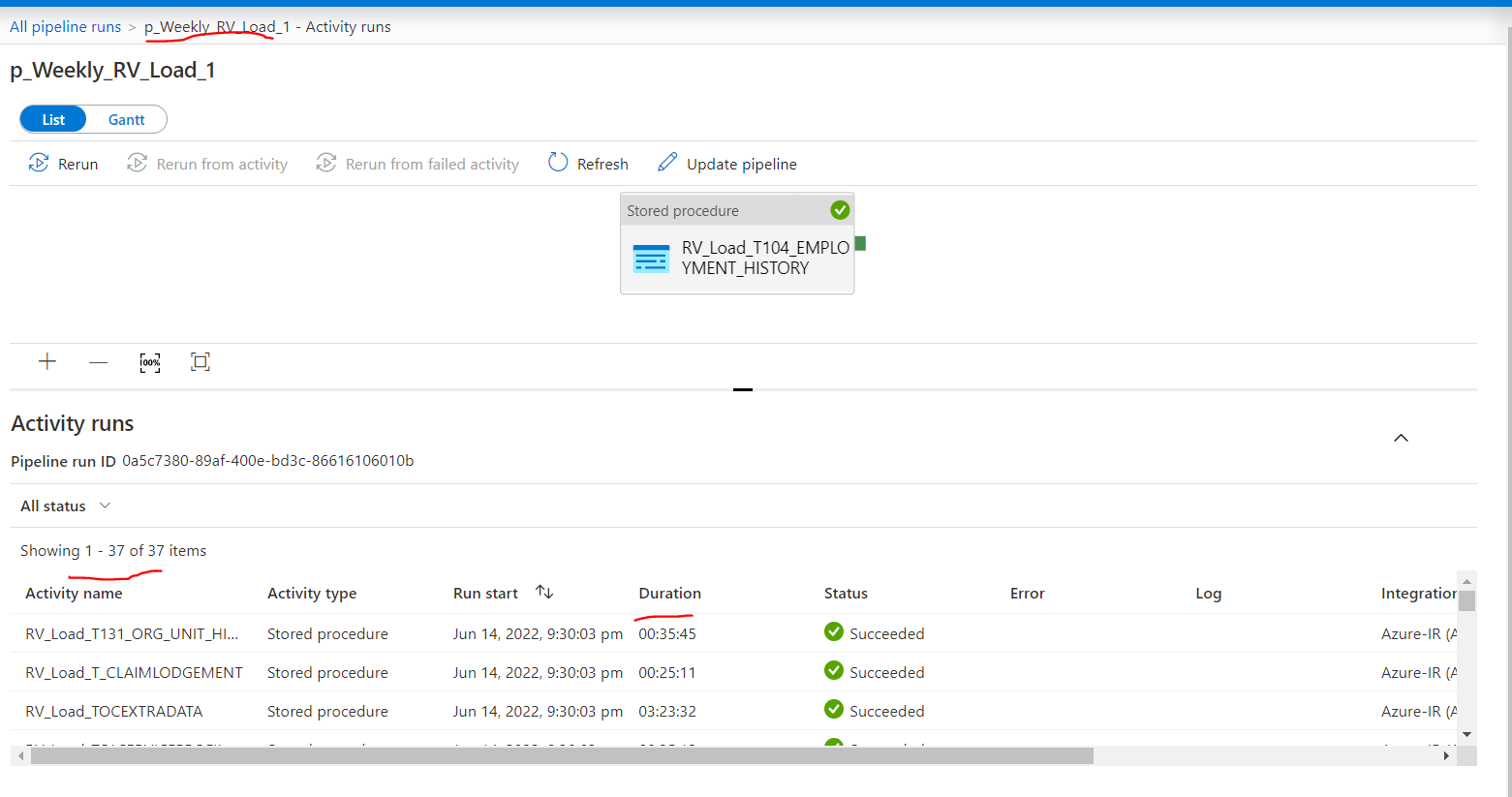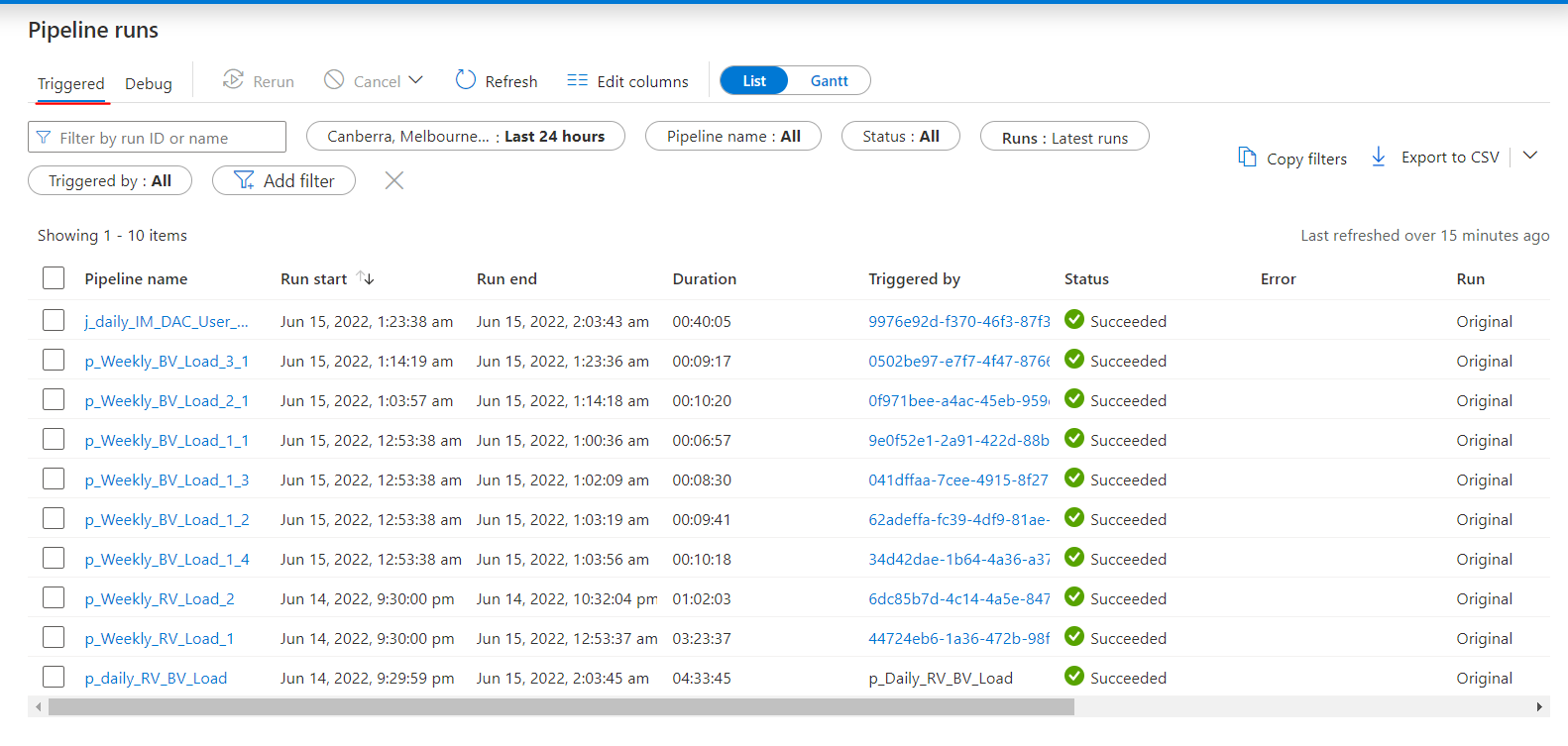 我希望将每个管道的运行时持续时间导出到CSV。如何做到或实现这一点?下面是运行到结束的计划管道,我可以使用Export按钮来获取这些管道的持续时间,但是每个执行管道都得到了那么多单独的作业(在本例中将采用P_Weekly_RV_Load_1),以及如何获得在p_weekly_RV_Load_中运行的所有单个作业的详细信息!致csv