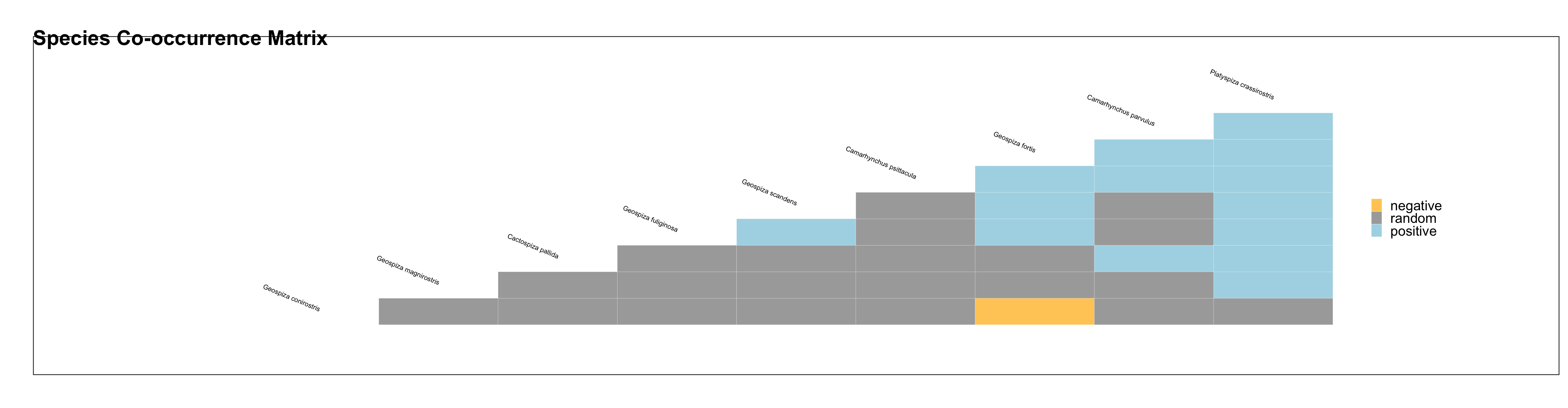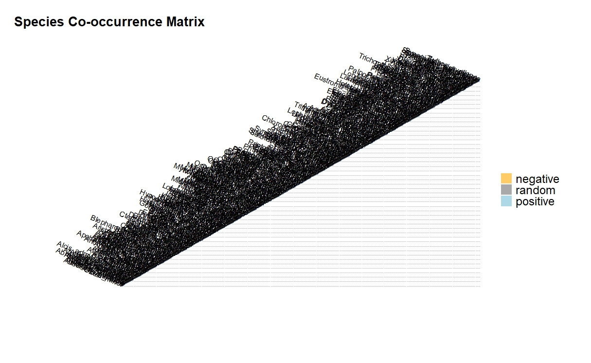 M <- cooccur(mat = M, type = "spp_site", thresh = T, spp_names = TRUE, prob = "hyper")