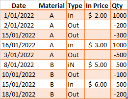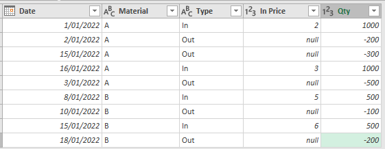 type table[Date=date, Material=text, Type=text, In Price=Currency.Type, Qty=Int64.Type, Running Total=Int64.Type, Avg Cost=Currency.Type]}