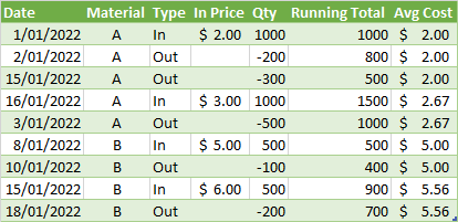 type table[Date=date, Material=text, Type=text, In Price=Currency.Type, Qty=Int64.Type, Running Total=Int64.Type, Avg Cost=Currency.Type])