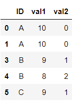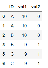 df  = {'ID':['A', 'A', 'B', 'B', 'B', 'C', 'C'],