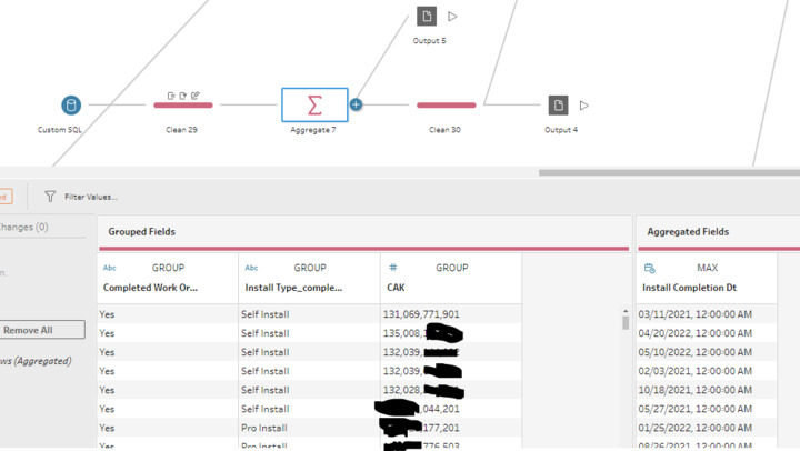 今天早上我的Tableau预科被更新为2021.4。更新之后,当刷新时,我的流开始遇到错误。错误消息是“系统错误: AqlProcessor评估失败:不再从套接字读取数据”。我能够识别在聚合步骤上发生的错误,我在屏幕截图中附加了聚合。基本上,我在聚合7之前和之后添加了一个输出步骤来测试失败的位置,聚合7之前的输出可以工作,但是聚合7之后的输出失败了。