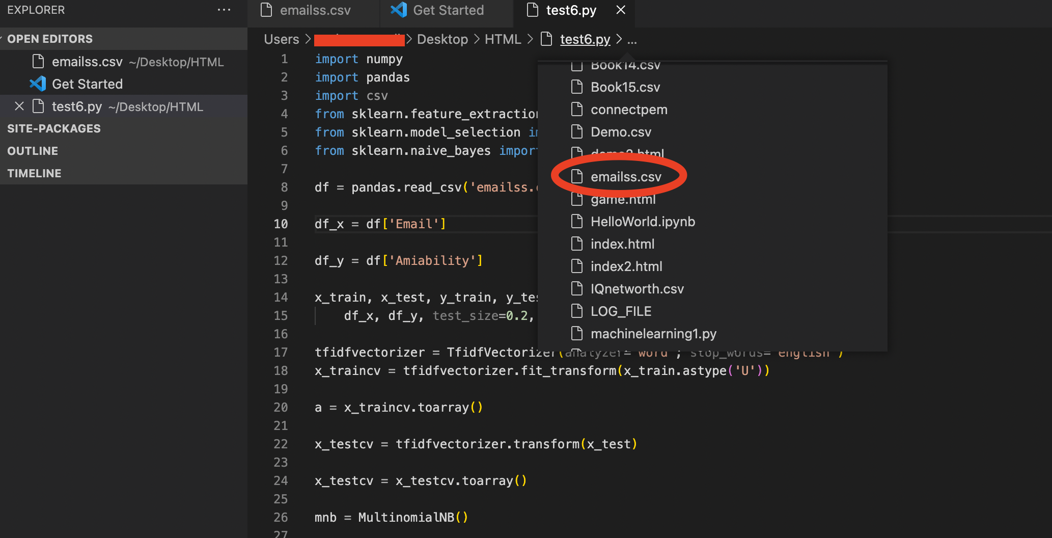 df = pandas.read_csv('emailss.csv', names=['Email', 'Amiability'])在运行程序之后,它说,