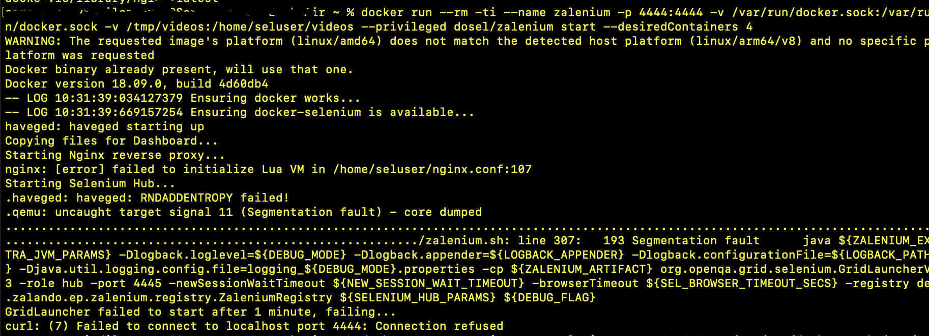 ............................................................................................................................................................................................/zalenium.sh:行307: 193个分段错误java ${ZALENIUM_EXTRA_JVM_PARAMS} -Dlogback.loglevel=${DEBUG_MODE} -Dlogback.appender=${LOGBACK_APPENDER} -Dlogback.configurationFile=${LOGBACK-Djava.util.logging.config.file=logging_${DEBUG_MODE}.properties -cp ${ZALENIUM_ARTIFACT} org.openqa.grid.selenium.GridLauncherV3 -role hub -port 4445 -newSessionWaitTimeout ${NEW_SESSION_WAIT_TIMEOUT} -browserTimeout ${SEL_BROWSER_TIMEOUT_SECS} -registry -registry ${SELENIUM_HUB_PARAMS} ${DEBUG_FLAG}