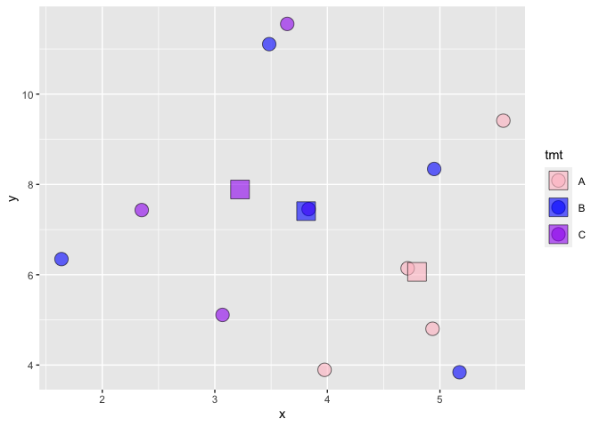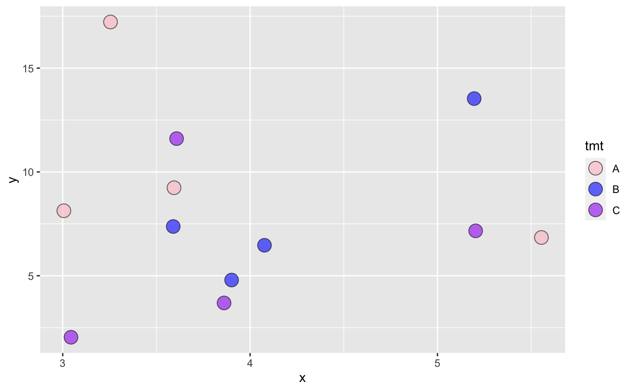 stat_summary(aes(fill = tmt), fun = 'mean', geom = 'point', size = 5) +