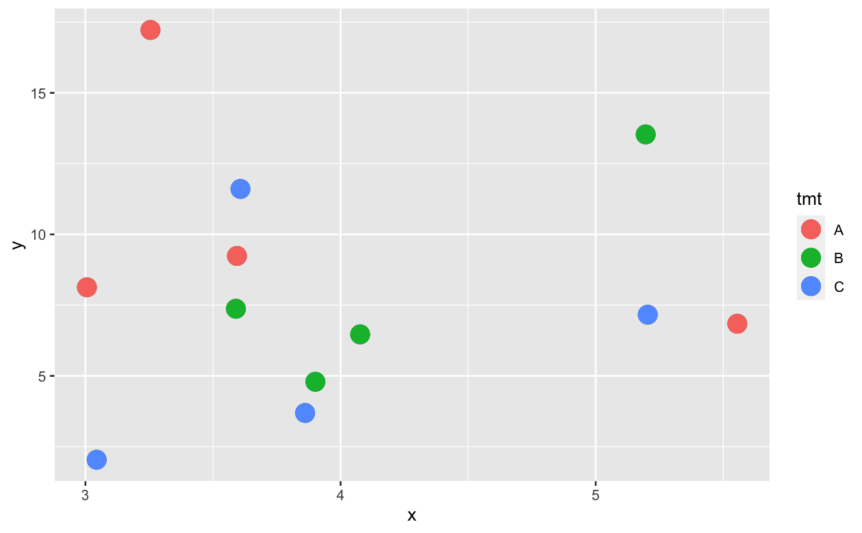 df <- data.frame(x = rnorm(12, 4,1), y = rnorm(12, 6,4), tmt = rep(c("A","B","C"), each = 4))