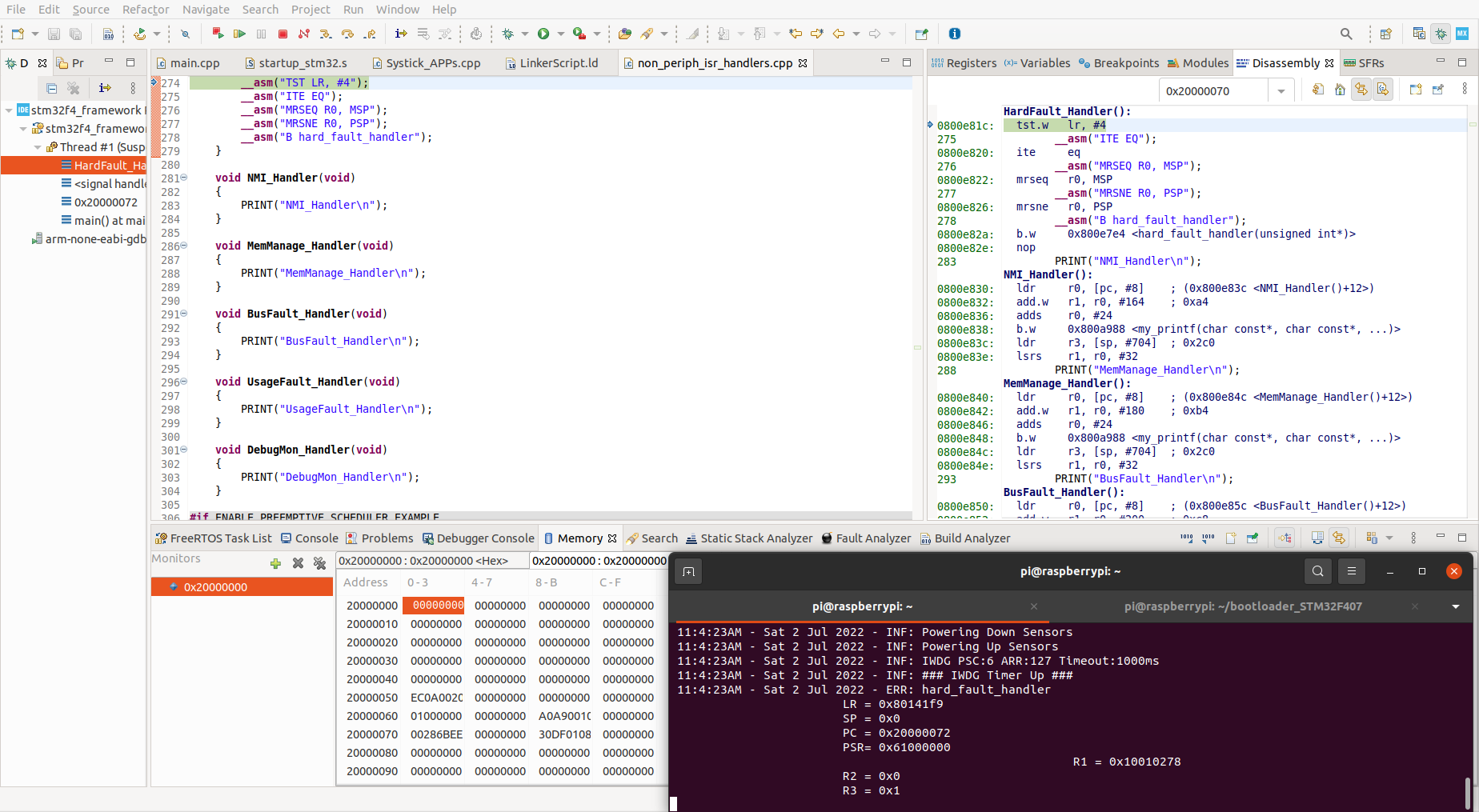 根据屏幕截图,您的代码跳转到SRAM (如预期的那样),但是SRAM中没有代码(MOV R0 R0表示内存填充了0),因此hardFault。
