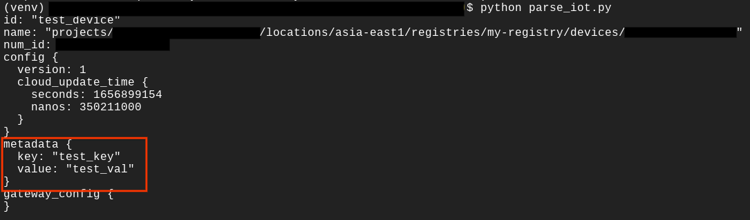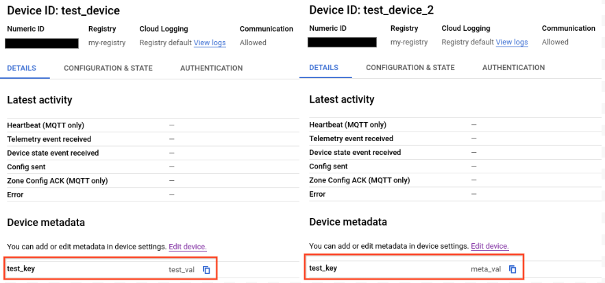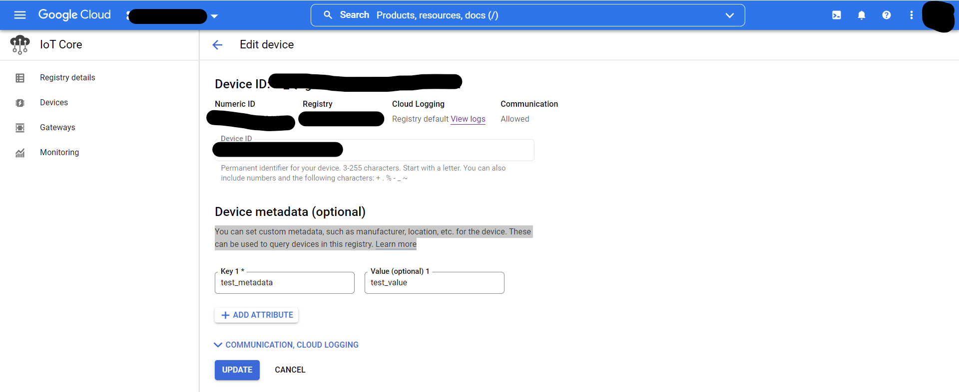 当我转到IOT核心注册表页面(在GCP控制台上)并选择一个设备时,我可以编辑它。那里有一个“设备元数据”部分,读取以下内容: