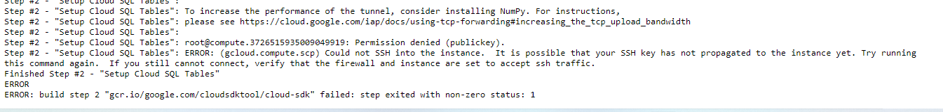 我需要在我的Compute引擎VM上执行命令。我们需要对SQL进行初始设置,计划是为此使用云构建(只触发一次);IAP已经实现,防火墙规则已经到位。(允许TCP 22在35.235.240.0/20之间)