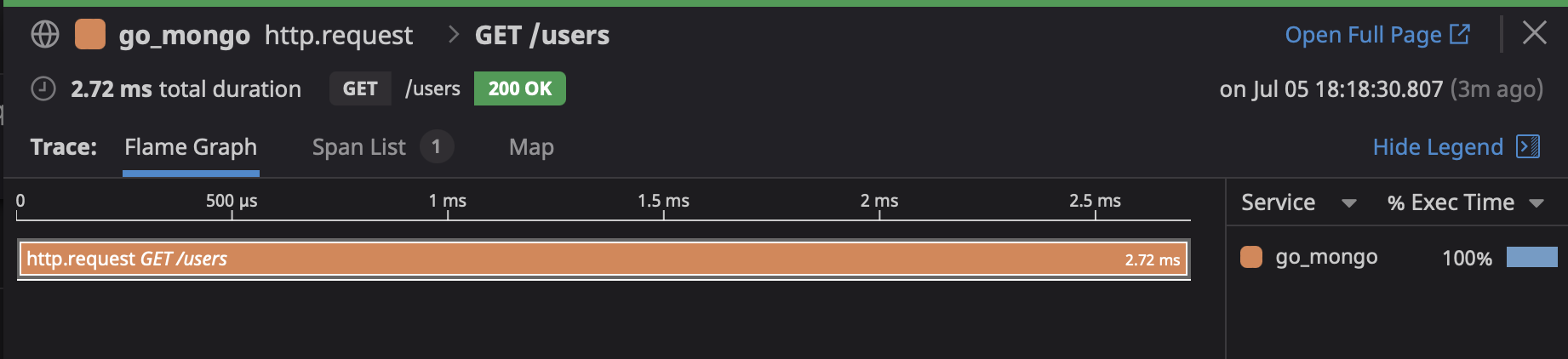 我在Go中构建了一个演示REST,其中MongoDB作为数据存储,Gin作为HTTP框架。我已经遵循了Datadog网站上的所有说明,然而,我得到的痕迹很少或根本没有信息。追踪到的只有http.request。在Datadog博客上有一个带有Go跟踪的截图(见下文)。