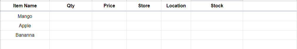 它应该检查苹果是否存在于Google sheet Column 1 Item Name 中,然后它应该开始填充剩余的列