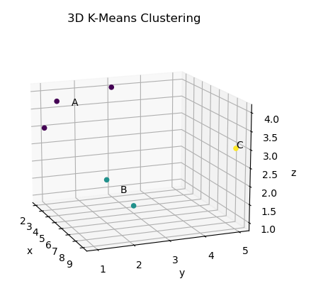 我想将k均值聚类应用于上述数据集.正如我们在上面看到的,三维数据集(X)。在那之后,我想用图表中的一个特定的集群标签来可视化三维的集群。如果需要更多细节,请告知。