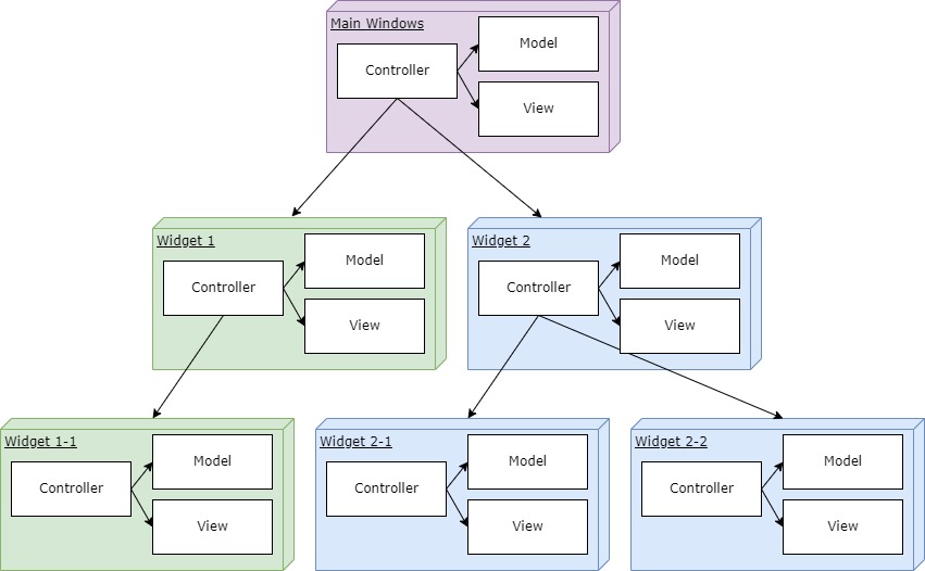 另一个想法是在单例类中创建信号。然后Widget 2-2可以很容易地发出这些信号,Widget 1-1也可以轻松地侦听这些信号。小部件在体系结构中的相对位置并不重要,每个人都可以发射和连接信号。