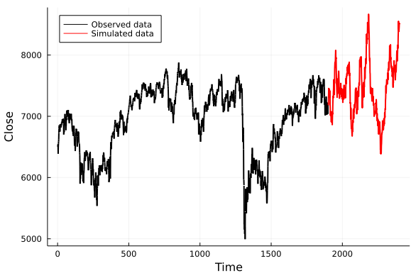 plot!(n+1:n+sim_size, asset_sim, color = "red", label = "Simulated data")