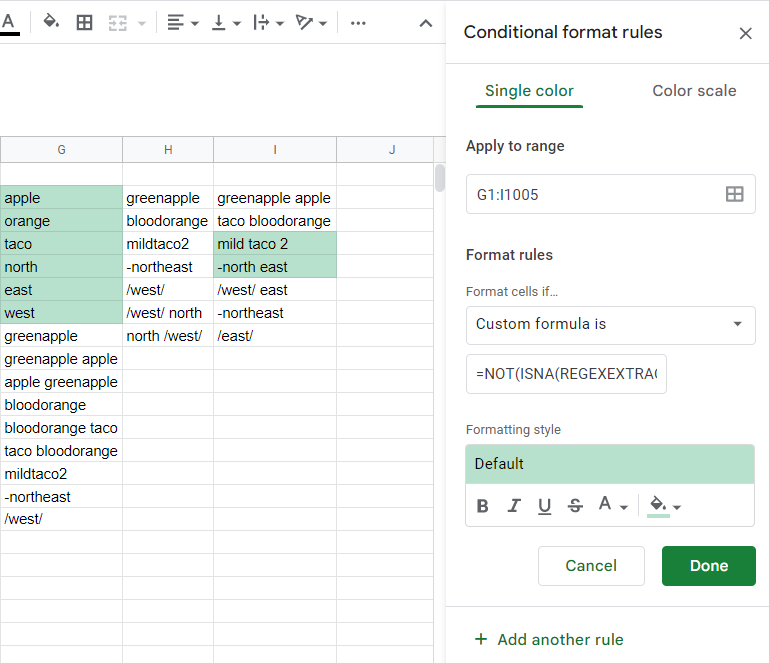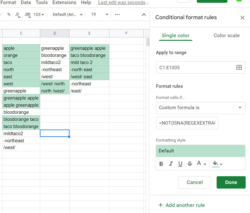 我正在寻找2个自定义公式在谷歌页,条件格式,将允许我添加多个词。1)如果细胞中含有苹果、橙色、玉米饼、北、东和西,则将其涂成绿色。但是,当这些单词包含在单词、数字或任何特殊字符中时,单元格应该将它们排除在外;例如,绿苹果、bloodorange、mildtaco2、-northeast和/west/。当单词前面和后面有一个空格时,它也应该将该单元格涂成绿色。( 2)我需要与上述相同的公式,但也可以排除使用相同条件的某些词语。而且,我需要能够很容易地添加新的单词,以包括和排除两者。谢谢!
