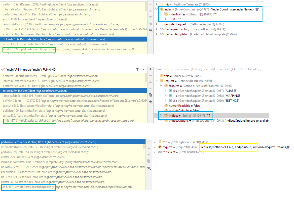 在SimpleElasticsearchRepository初始化期间,它会执行以下操作。我的索引是createIndex = true。因此,它将检查是否存在()。但是索引在这里是空的,所以HEAD / my_index变成HEAD /。