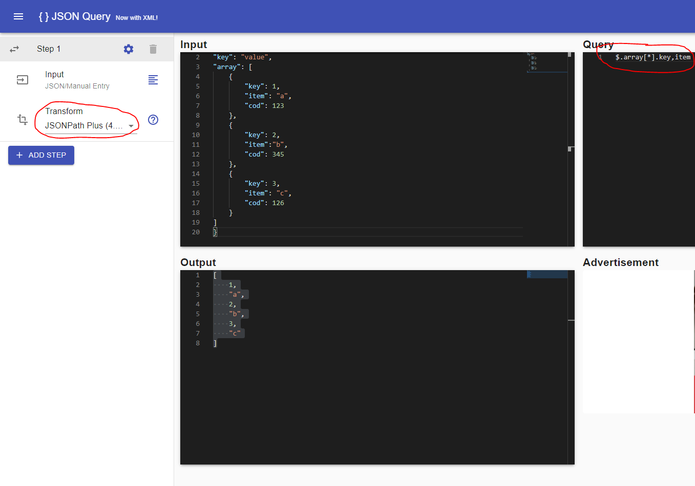 从@Serge (谢谢.)开始,我重新尝试使用我在初始测试中使用的https://www.jsonquerytool.com/,但更改了使用的转换(本例中为JSONPath Plus (4.0.0) ),以及它的“现在工作”
