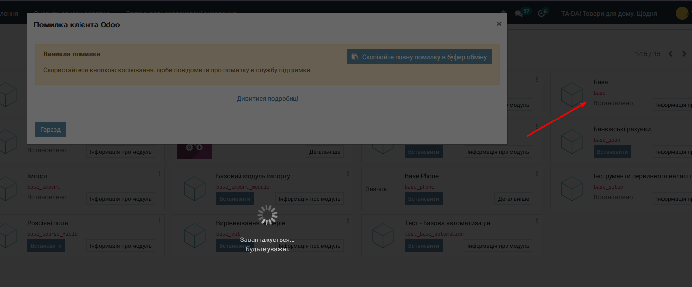 我试图更新模块“基础”,一个错误发生,加载没有结束。