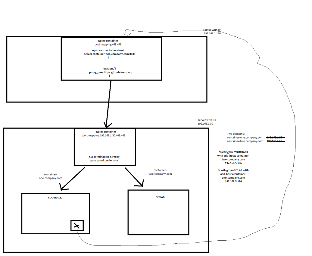 我可以提到,Nginx的配置实际上只是基于域的ssl终端和映射。如果域容器-one.company.com代理传递给您跟踪容器和它的端口,如果容器-two.company.com代理传递给gitlab cotn流变器及其内部端口。全是普通的http,没有并发症。