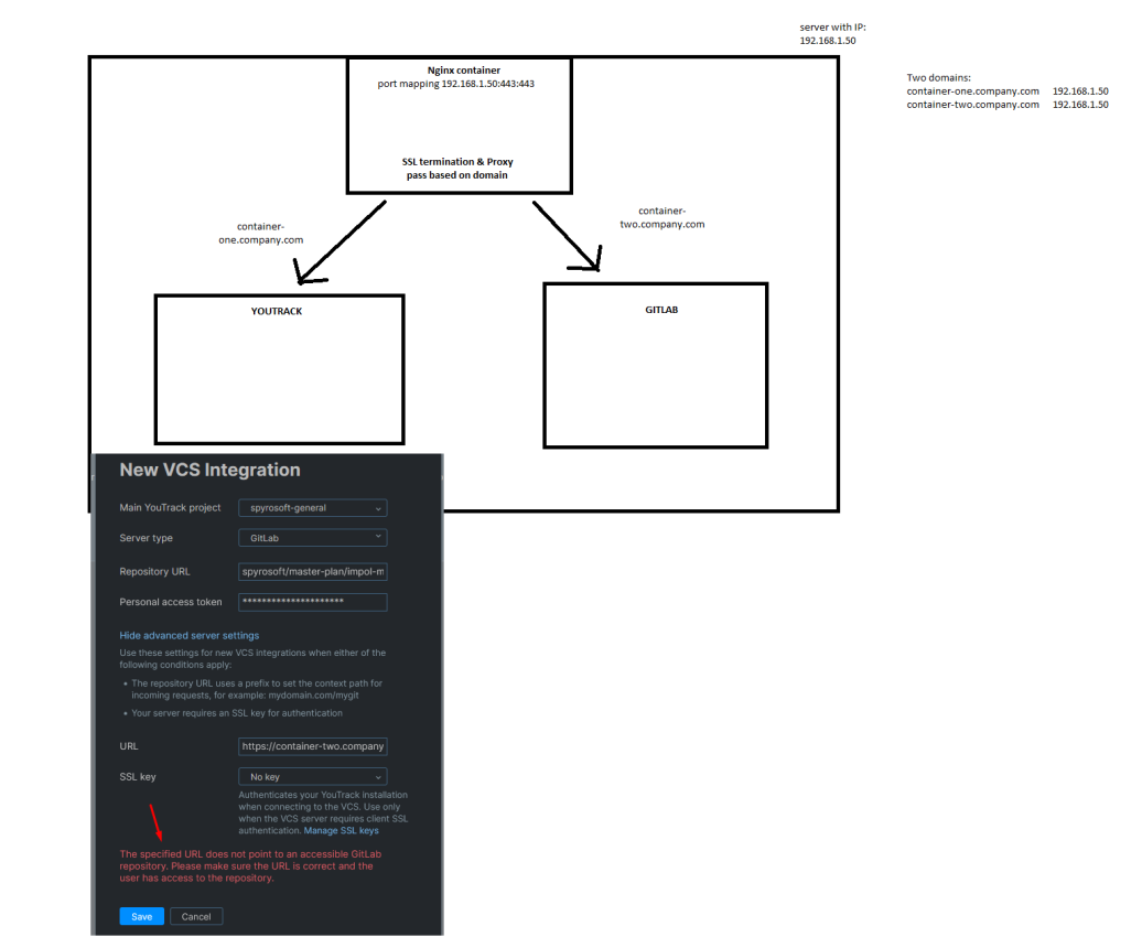 这是当前的设置和所需的设置。正如您所看到的,当试图使用FQDN在同一主机上使用FQDN从YOUTRACK容器到GITLAB one进行VCS集成时,它都失败了,表示它没有映射/指向一个有效的存储库url。
