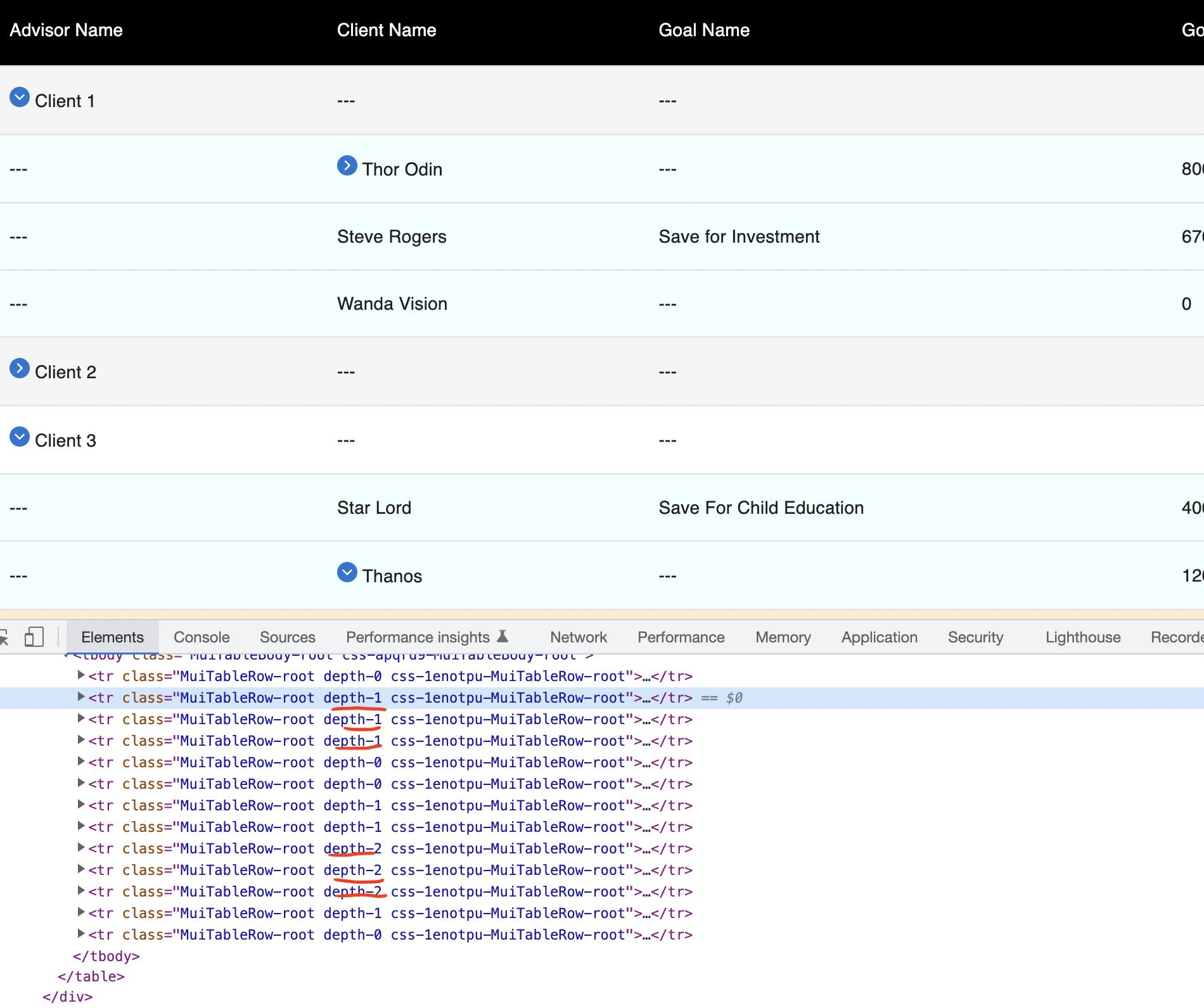 目前,我被要求将边框顶部和边框底部添加到第一行和最后一行中,我们在展开后显示的行列表中。请参阅所附截图,以更好地理解。假设图像中的红线是边框。扩展后的每一行都有一个className作为depth-1