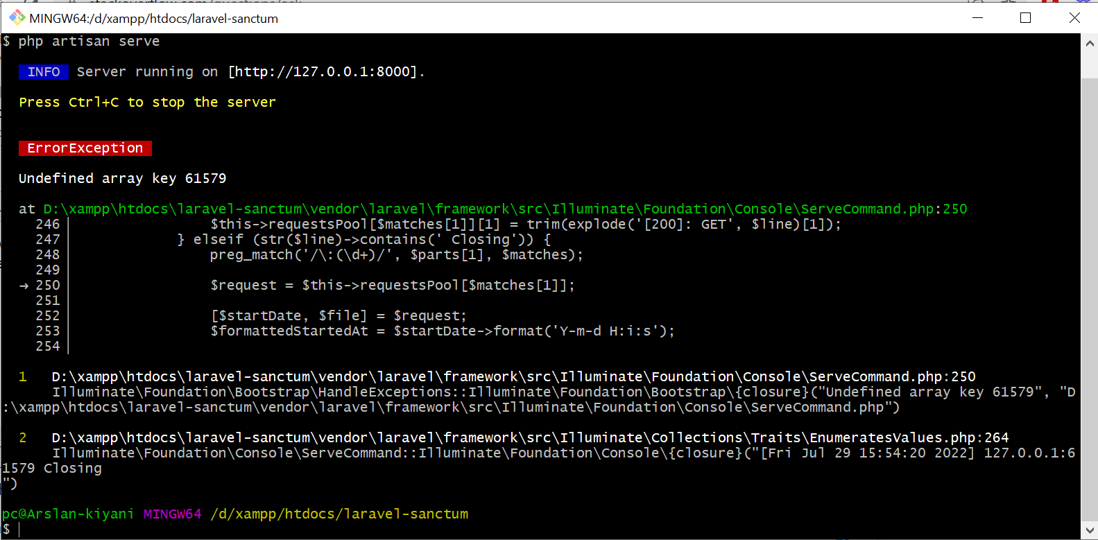 我是laravel开发公司的新手。我使用的是最新版本的laravel,当我用gives或VS代码终端编写php artisan serve时,有时会出现错误。我附上了一个错误的截图。