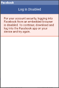 为了您的帐户安全,从嵌入式浏览器登录Facebook是禁用的。要继续,下载并登录到设备上的Facebook应用程序,然后再试一次。