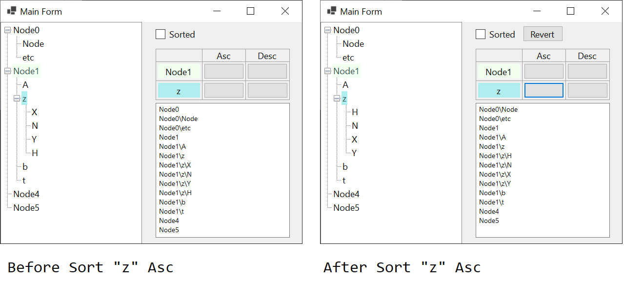 。使用默认排序器(升序字母排序)对所有节点进行排序的控件。任何之后以不同方式对节点进行排序的尝试都会失败。您将注意到,当删除、排序和重新插入特定节点的子节点时,不会发生任何事情,因为一旦插入这些子节点,默认的排序器将干扰并恢复不同的排序。同样,所有提到的都是在任何其他排序例程之前调用.Sort