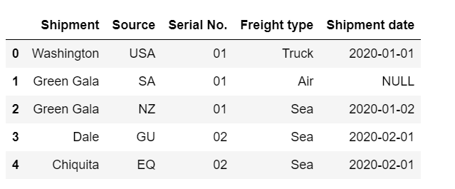 'Shipment date': ['2020-01-01','NULL','2020-01-02','2020-02-01','2020-02-01']})