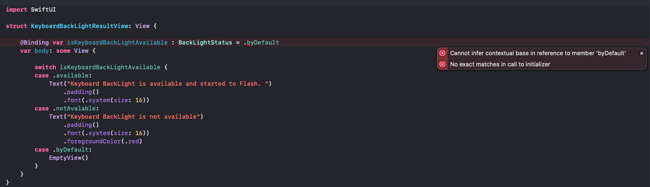 @Binding var isKeyboardBackLightAvailable : BackLightStatus = .byDefault // Error warning pops up here in xcode