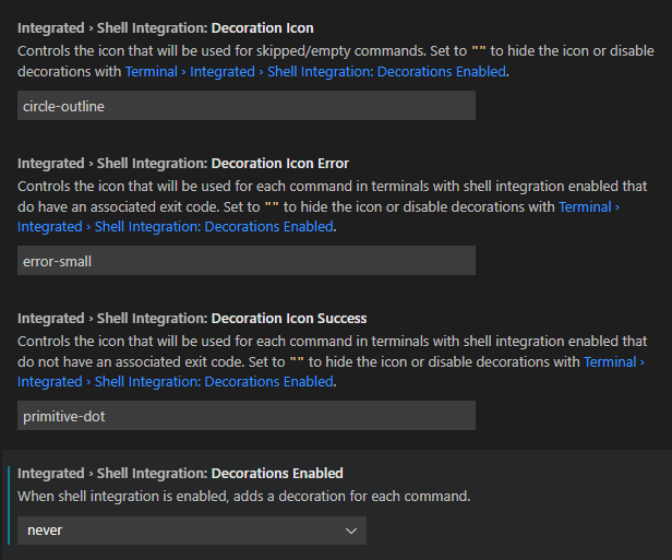 我通过设置集成> Shell集成:装饰品来摆脱它们。这是在功能>终端下的用户设置。