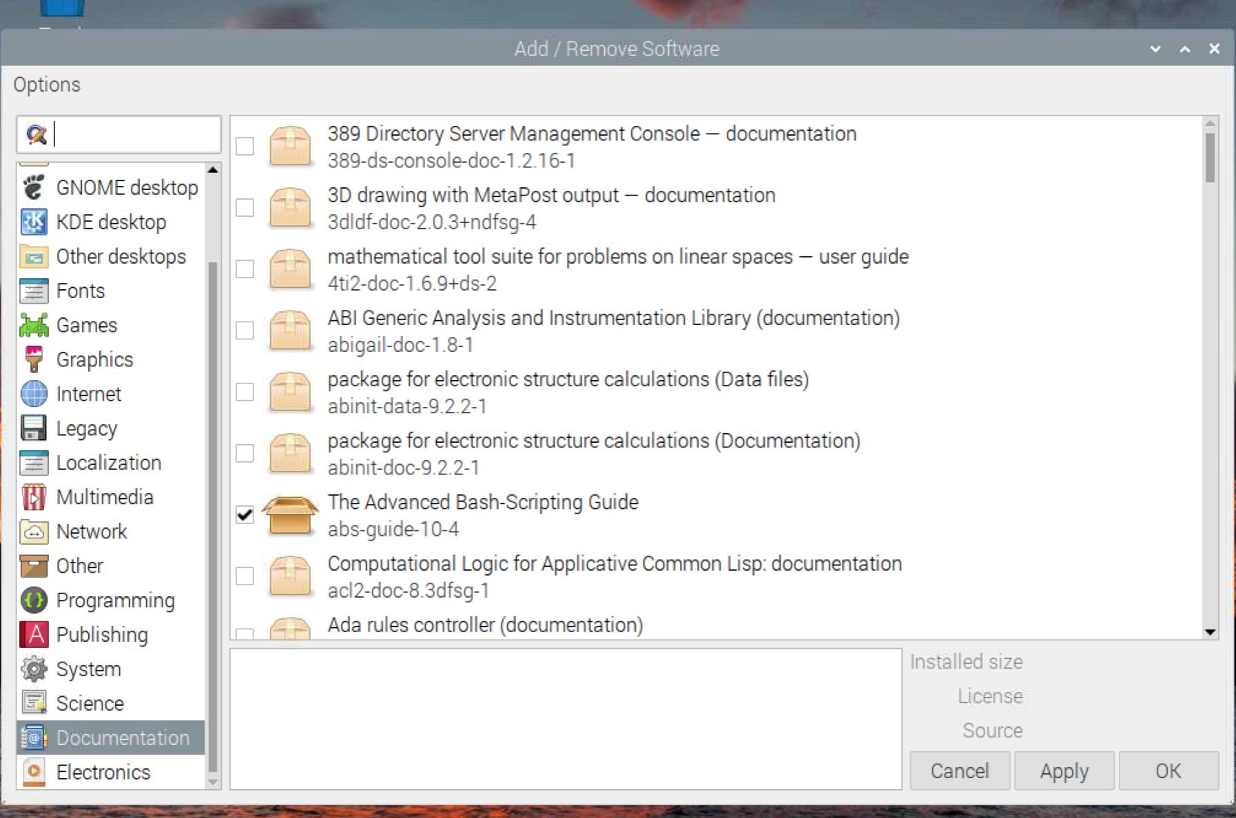 我一直在玩RPI4,并发现在Add/Remove软件下面有一个可以下载文档的部分。我安装了一些软件包,我认为这些包读起来很有趣,但在我的pi上找不到它们。我在网上寻找解决方案,但没有在这个问题上找到任何东西。我检查了我的计算机上的所有文件,即使我运行“where is”,它也没有说明它安装在pi上的位置。