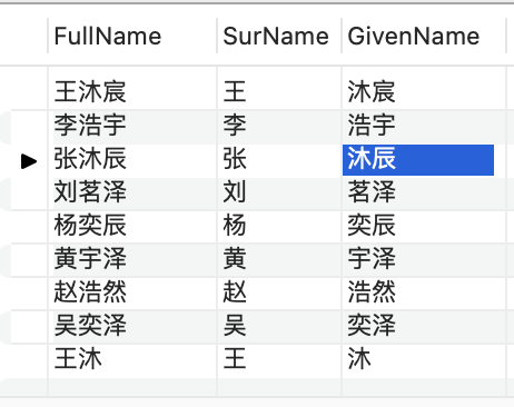 因此,我有一个表,它有一个列'full_name‘,它以surname+given名称的格式存储中文名称。